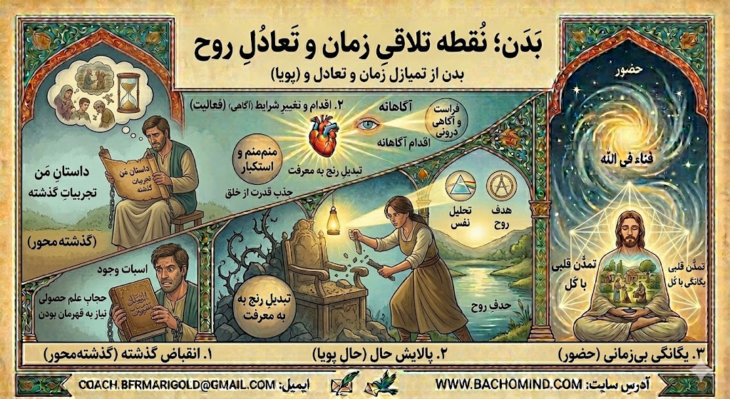 گذشته: تمام آن دانشهای حصولی، تجربیاتِ دردناک و الگوهای قهرمان یا قربانی بودن، به صورت انقباضها، خاطرات سلولی و الگوهای عصبی در بدن ذخیره شدهاند.